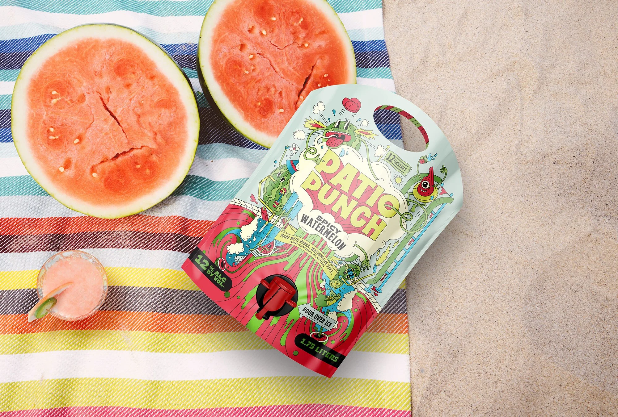 A portable party pouch exploding with all the quirk and color of a summer spent outside with friends. We developed and illustrated this bright and loud brand and packaging system with custom characters to illustrate those singular summer occasions and tap into that nostalgia.